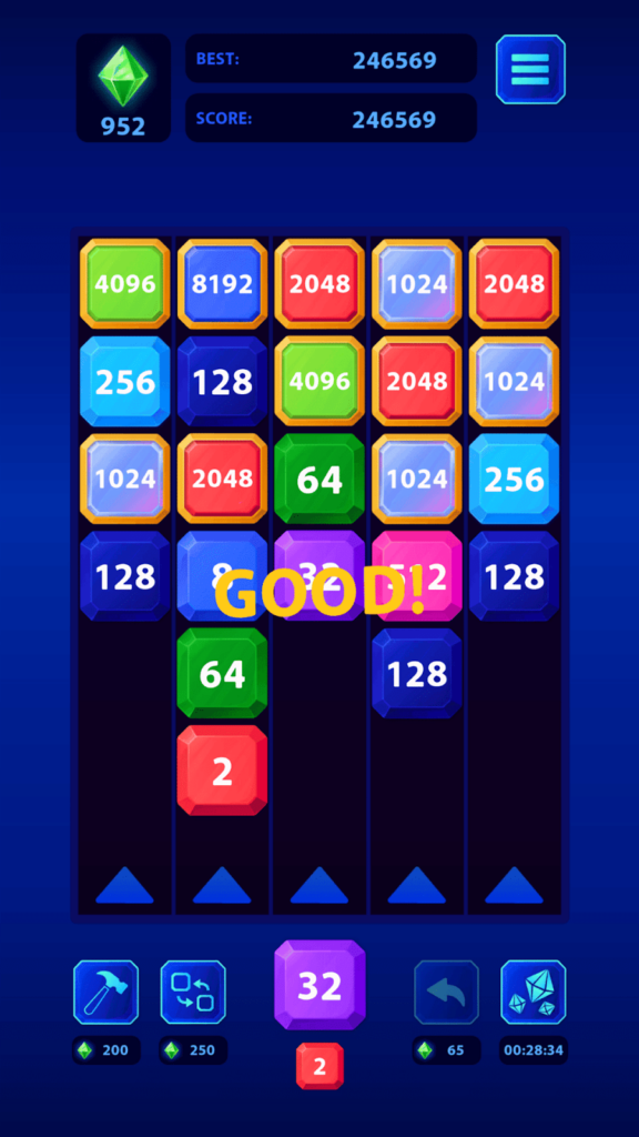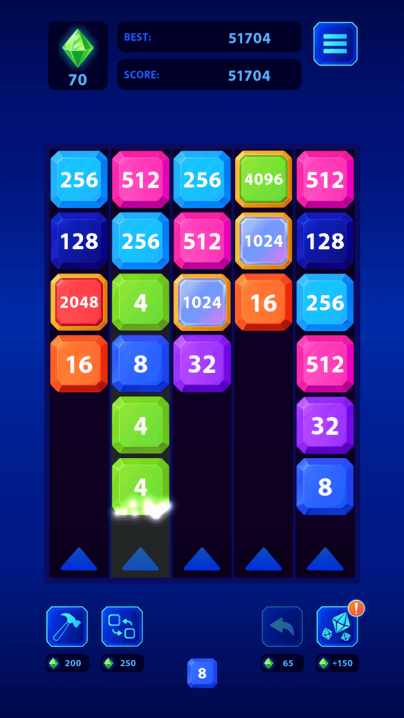 This is 2048 meets bubble shooter. Instead of sliding tiles on a grid, you shoot numbered blocks at other blocks with the same number to combine them into higher values. The goal is to reach the highest number possible (ideally 2048 or beyond) before running out of space. You aim and shoot blocks upward, and when they hit matching blocks, they merge. The challenge is managing the limited space—if blocks stack too high, it’s game over. There are boosters to help when you’re in a tight spot, which add a bit of strategy. The shooting mechanic makes it feel more active than traditional 2048, but the core concept is identical. It’s a decent twist on a familiar formula.