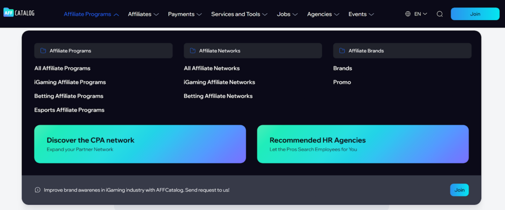 AFFCatalog is an affiliate aggregator that collects and structures the data on affiliate teams and programs, tools and services, putting them in a single space. You can discover and compare potential partners and get rid of multiple tabs in your browser.